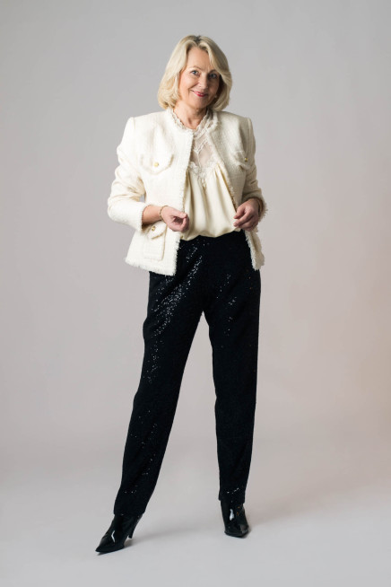 Palliet-bukserne er syet i en kraftig jersey med påsyede pallietter, som en løs buks med elastik i den lidt lave talje.