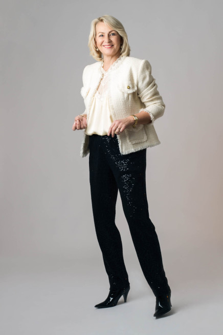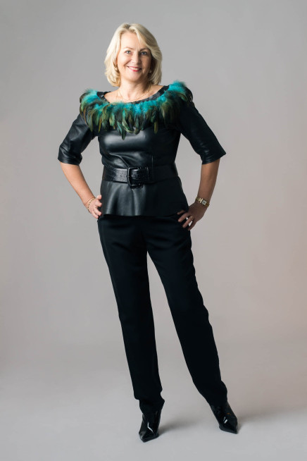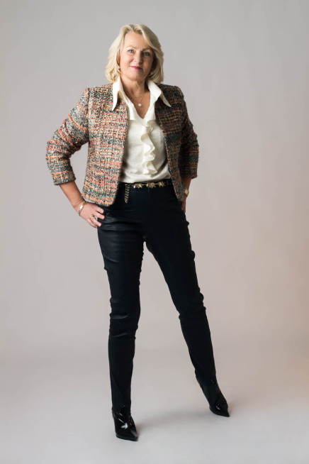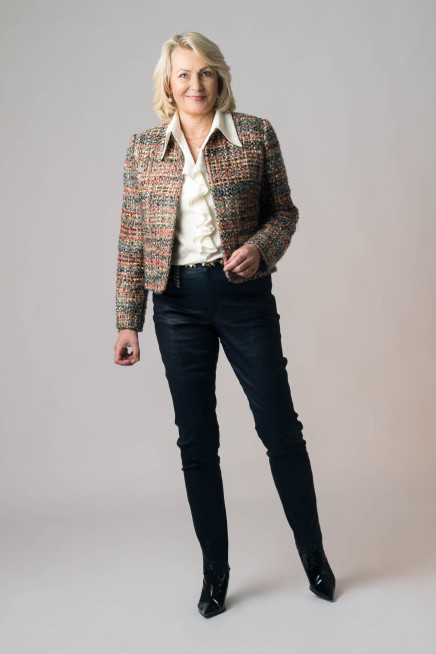 Denne skindbluse er syet med peplum-skød og en aftalelig fjerkant. Buksen er en klassisk smal buks.