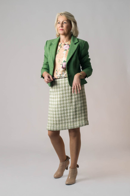 Nederdelen er en helt enkel pencil-nederdel, denne udgave i en lækker ternet uldboucle.